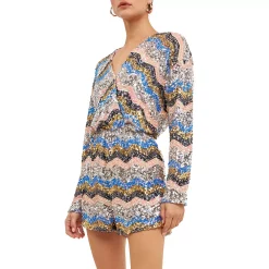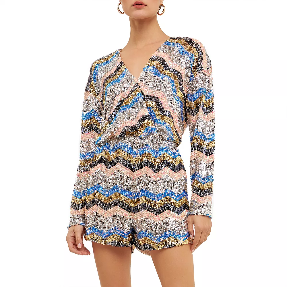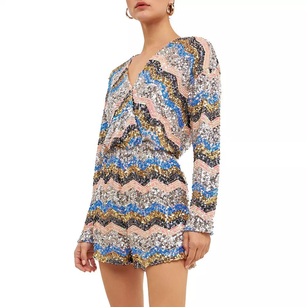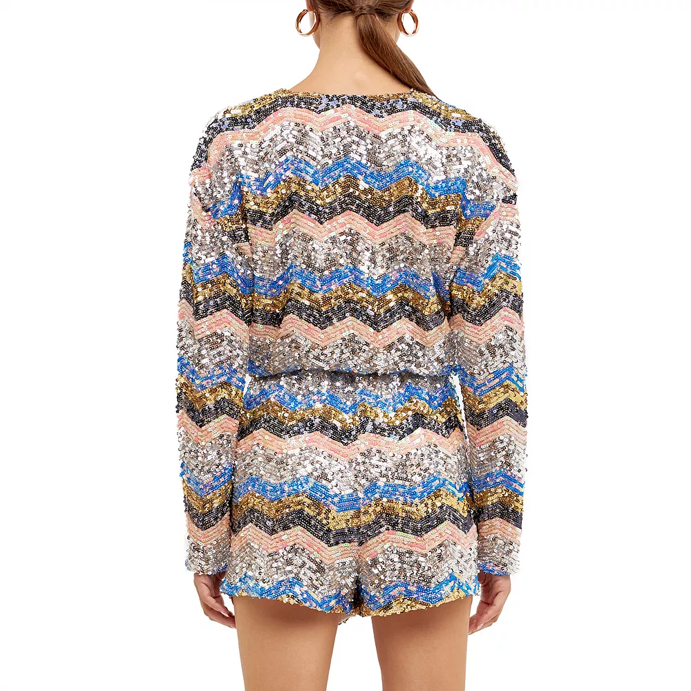 Shine on in this dazzling romper. With its chevron sequins and zig,zag stripes, this long,sleeve romper is sure to turn heads. The wrap style and deep V neckline create a look that is modern and sexy. Whether you’re hitting the town or spending a weekend at home, this romper is perfect for any occasion. The lining makes it comfortable to wear, while the hook and eye closure provides a customizable fit.