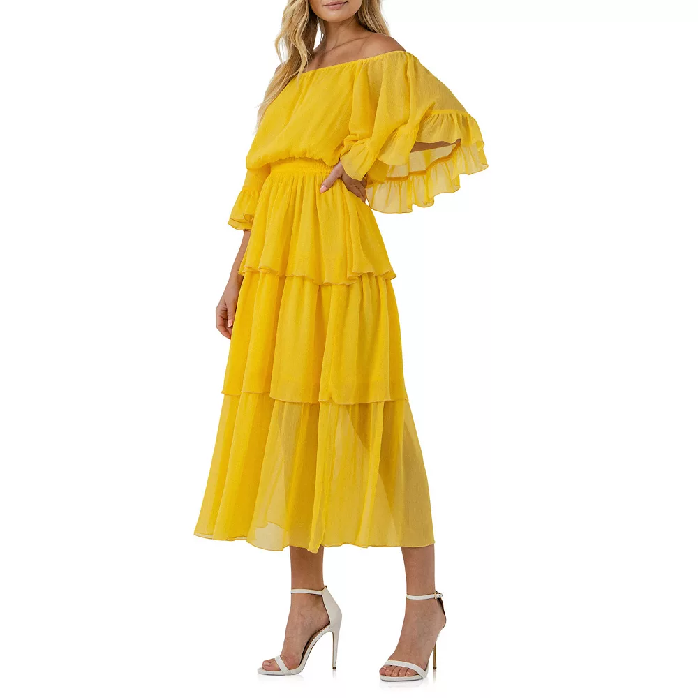 For a touch of elegance this maxi will be your go-to. With an off the shoulder neckline and ruffled tier design this maxi is perfect for any special occasion. Made with sheer chiffon fabric and lined with soft fabric it’s also comfortable to wear. With an elastic waistband it’s easy to put on and take off.