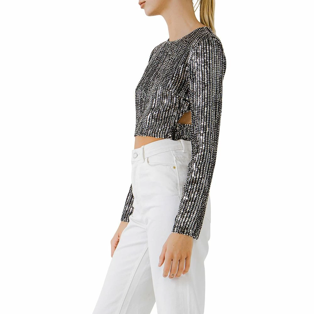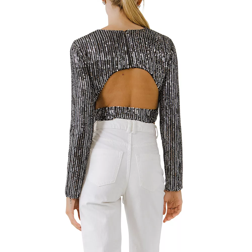 This sequin crop top is the perfect thing to wear to your next holiday party. This long sleeve, fitted crop top features a sequin overlay on the front and back. The open back is sexy and edgy while the long sleeves are cute and cozy. Pair this with your favorite jeans and show off your fun side.