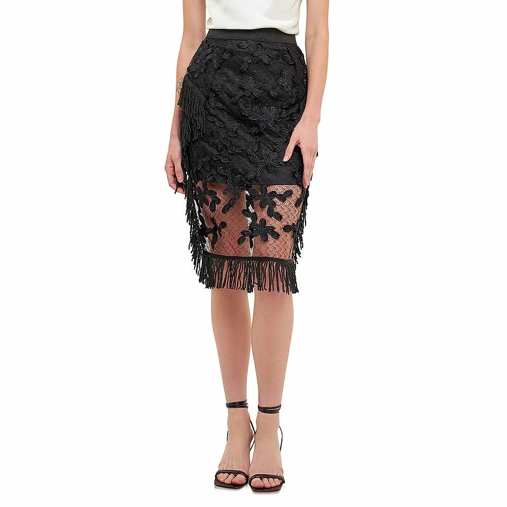 Be a trendsetter with this statement-making lace mini skirt. A unique and stylish take on the essential mini skirt. This piece is perfect for dressing up or down, making it a versatile addition to your wardrobe. With its pretty floral print and delicate fringe detail, this skirt is sure to turn heads.