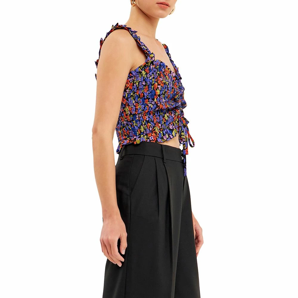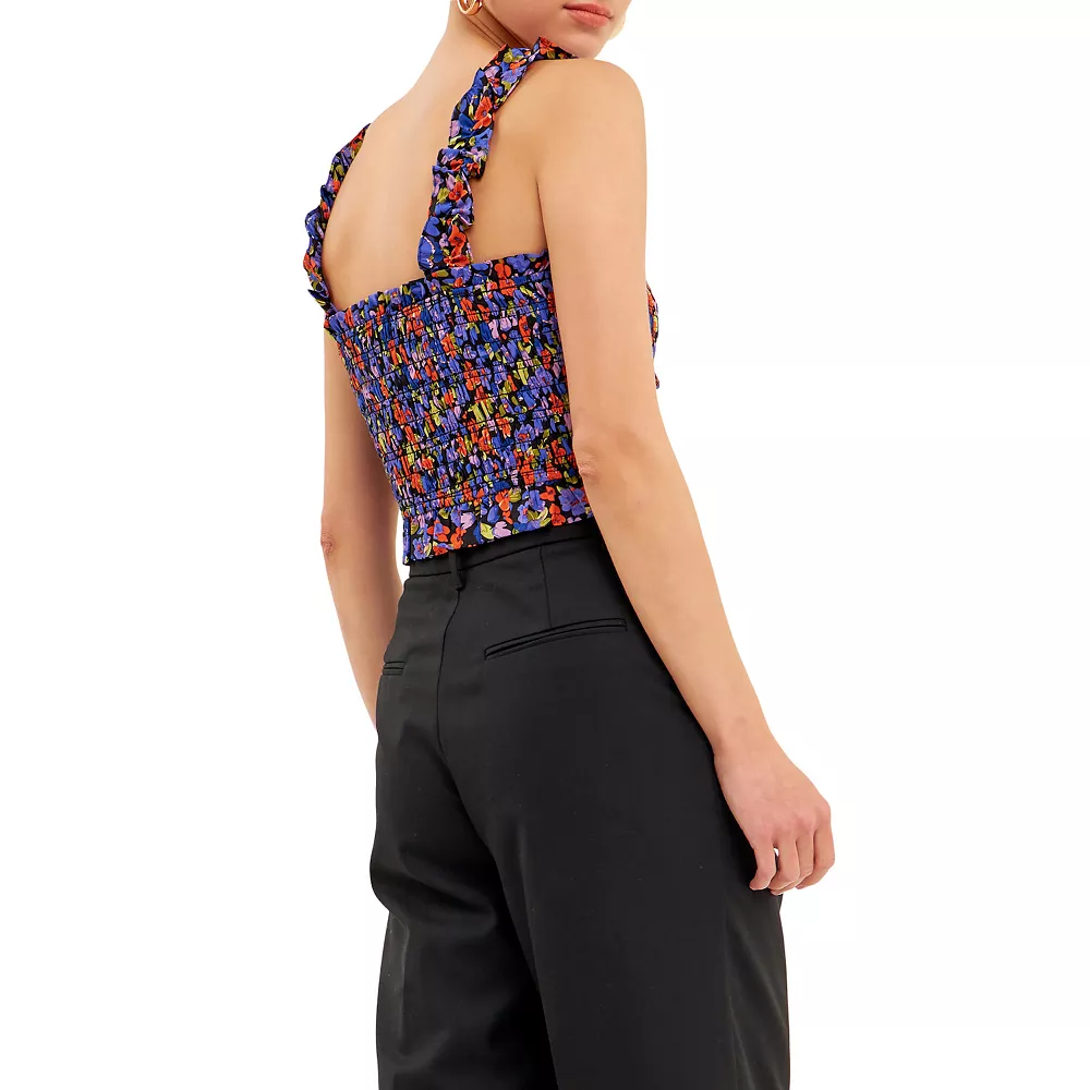 Add a touch of femininity to your wardrobe with this Floral Print Smocked Top. Made with delicate floral prints, this top features a smocked top, sweetheart neckline, and shoulder straps. The sleeveless silhouette and center front adjustable strings make this top perfect for a day out in the sun.