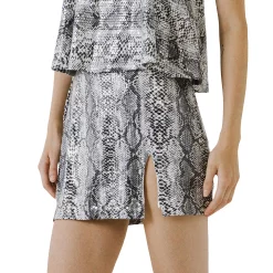Looking to add some edge to your wardrobe? This Front Slit Python Skirt is perfect for you. With a python print and sequin detail, this miniskirt is sure to turn heads. The slit detail at the front adds a touch of sexiness, while the zipper closure with hook-and-eye keeps everything in place. You’ll love the way you look and feel in this skirt.