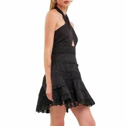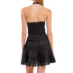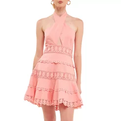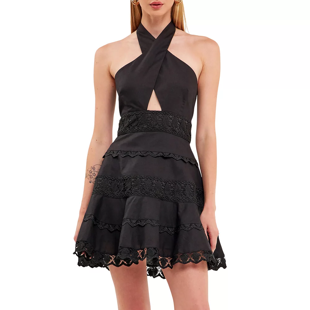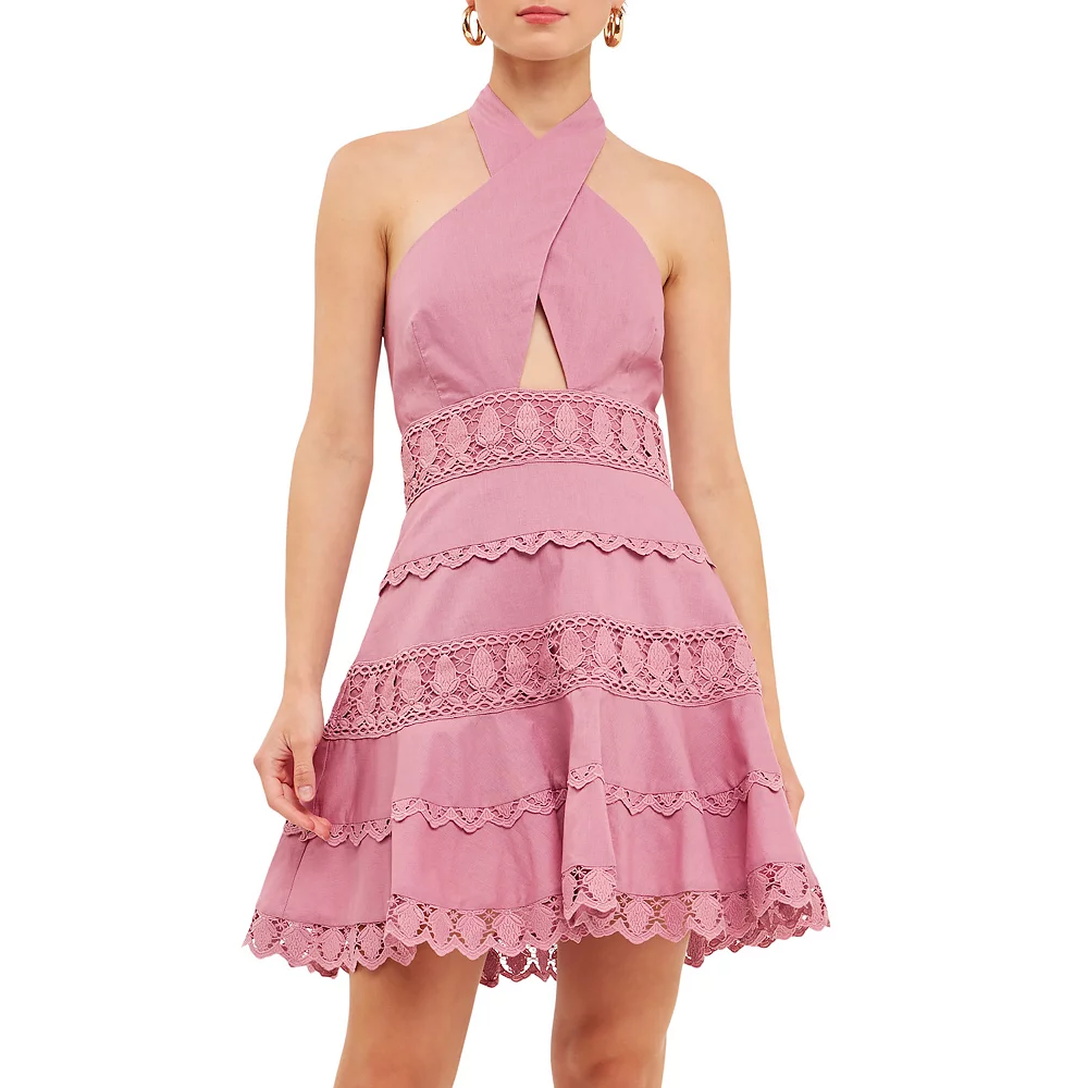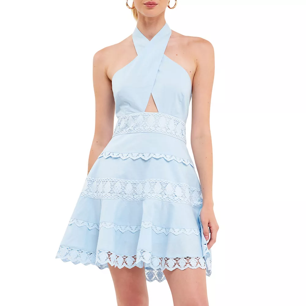 Looking for a summer dress that’s both chic and flattering? This halter neck lace trim dress is perfect! The crossed halter neck flatters your shoulders and neck, while the lace trimmed skirt adds a touch of elegance. The center back invisible zipper closure ensures a perfect fit, and the smocking detail at the back bodice adds a bit of flair. Whether you’re headed to a summer wedding or a day at the beach, this dress is sure to turn heads!