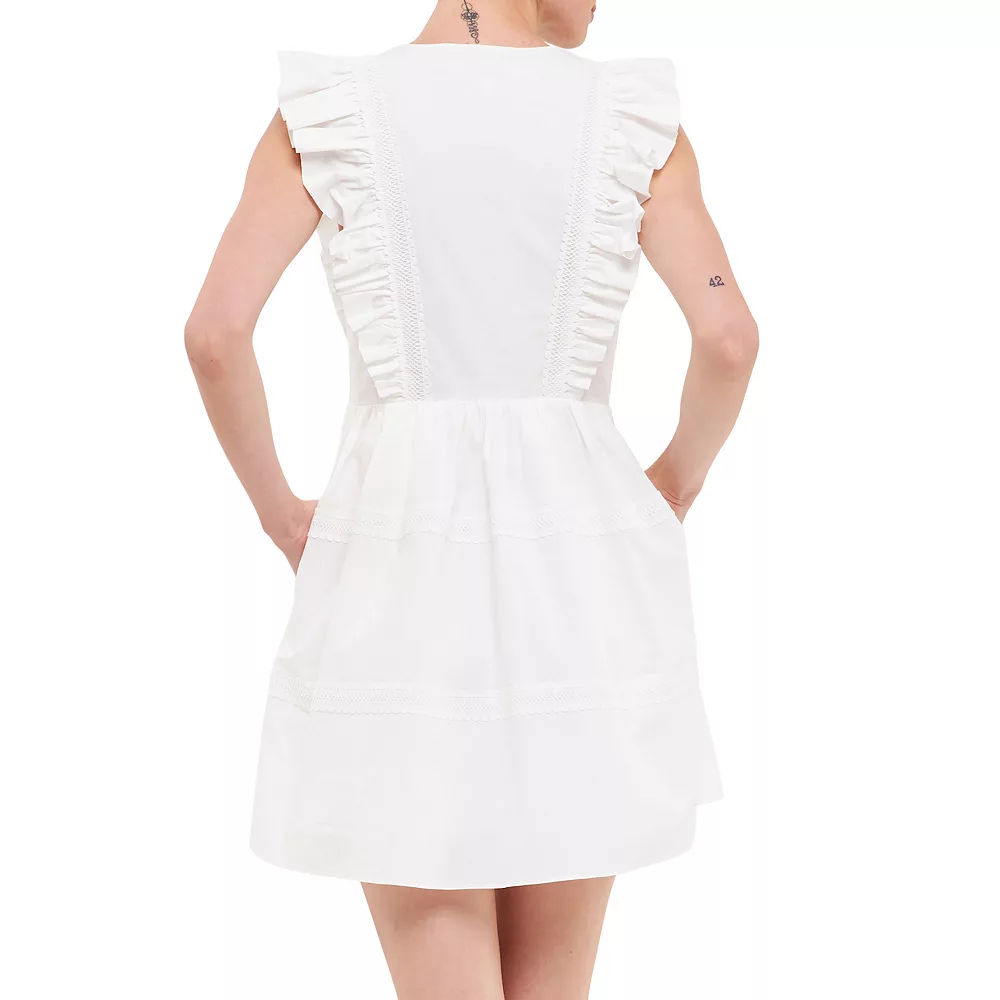 Delicate and dainty. Lace trimmed and V-necked. This ruffled mini dress is perfect for any special occasion. The V-neckline is flattering on any figure, and the side pockets add a touch of functionality. The lace trim and mini length give this dress a fun and flirty feel, while the lining and poplin fabric provide just the right amount of structure.