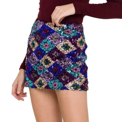 Ready to turn heads and light up the room? This Multi Sequin Mini Skirt from ENDLESS ROSE is perfect for you. With a fitted silhouette and colorful sequins, this skirt is sure to make a statement. The invisible zipper at the side ensures a smooth and effortless fit while the piping at the waist adds a touch of refinement. Dress it up with heels and a blouse for a night out or keep it casual with a t-shirt and sneakers. However you style it, you’re sure to look amazing.
