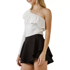 Fun and flirty, this one-shoulder top is perfect for any occasion. The soft knit fabric and ruffle detail create a flattering fit that’s perfect for work or play.