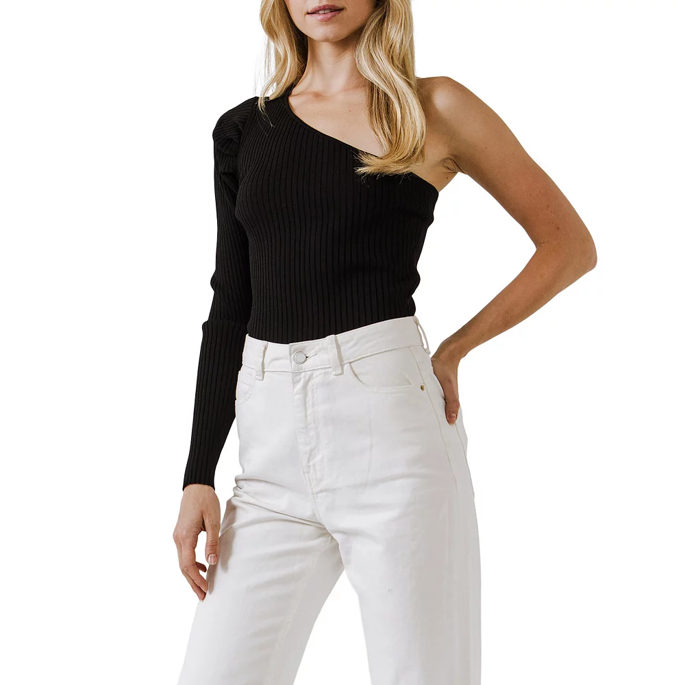 This top is perfect for a night out! With puff sleeves and a one shoulder style, this top is sure to turn heads. Made with a ribbed knit fabric, it’s super comfortable and perfect for a night out. With a regular length and sexy style, this top is sure to make you feel confident and beautiful.