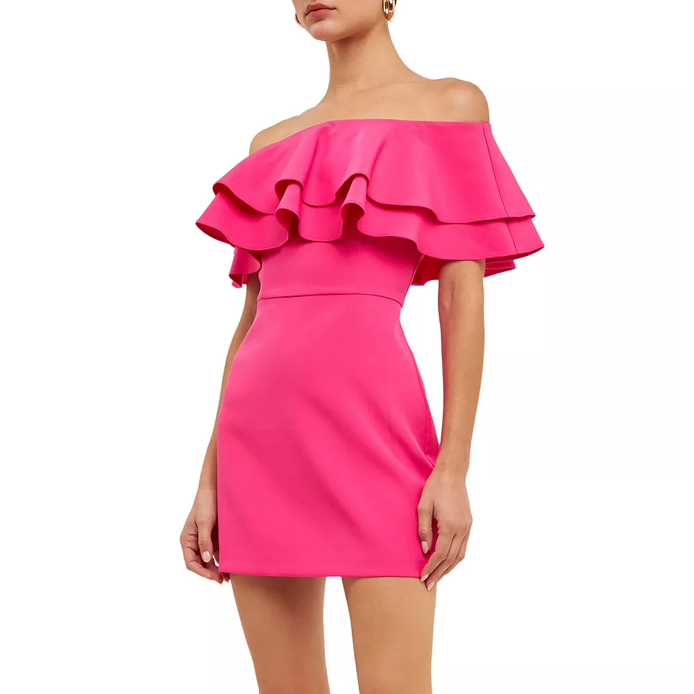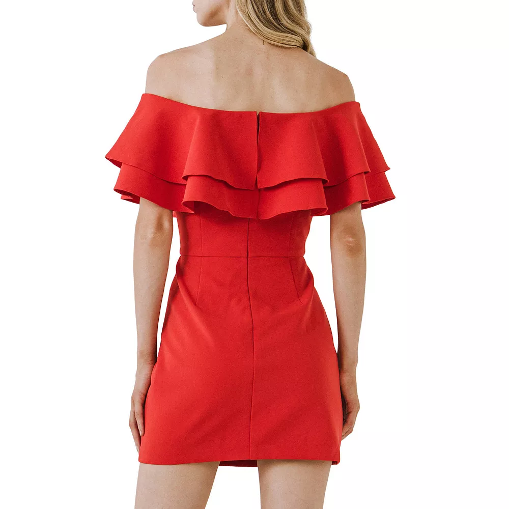 Feel confident and flirty in this ruffled off shoulder mini dress. The perfect mix of sweet and sexy, this dress features 2 layers of ruffles along the neckline. The mini length is perfect for showing off your legs, while the center back zipper closure ensures a perfect fit. Whether you’re headed to a party or a night out on the town, this dress is sure to turn heads.