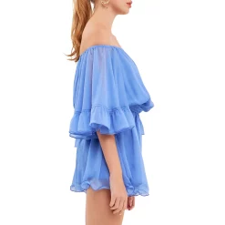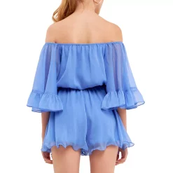 This ruffled sleeve romper is perfect for a day of fun in the sun. The off-the-shoulder silhouette and ruffle sleeves add a touch of femininity to this casual piece. The elastic at the waist ensures a comfortable and flattering fit. Made from a solid chiffon fabrication, this romper is sure to become your new go-to piece for any casual occasion.