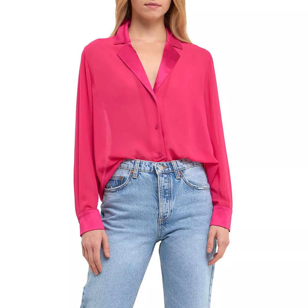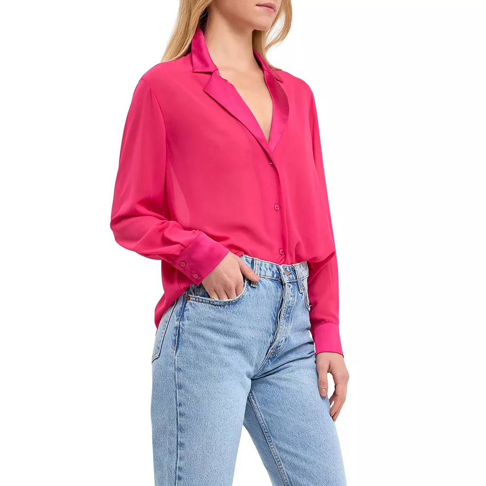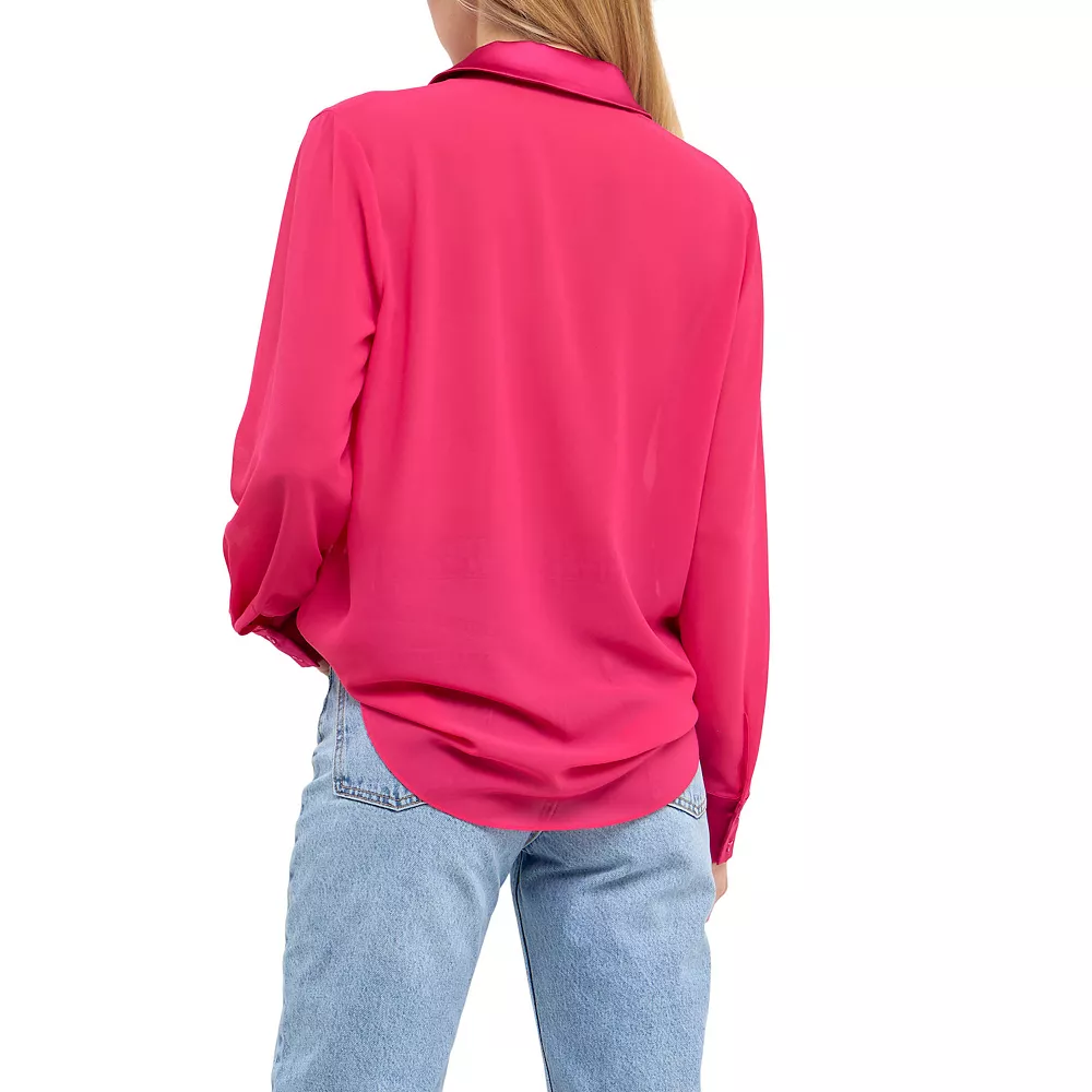 Spruce up your work wardrobe with this satin chiffon dress shirt. The loose fit and front buttons give you a stylish and comfortable look while the contrast fabric collar and cuffs add a touch of sophistication. Pair this shirt with slacks and heels for a professional ensemble or dress it down with jeans and flats for a more casual look.