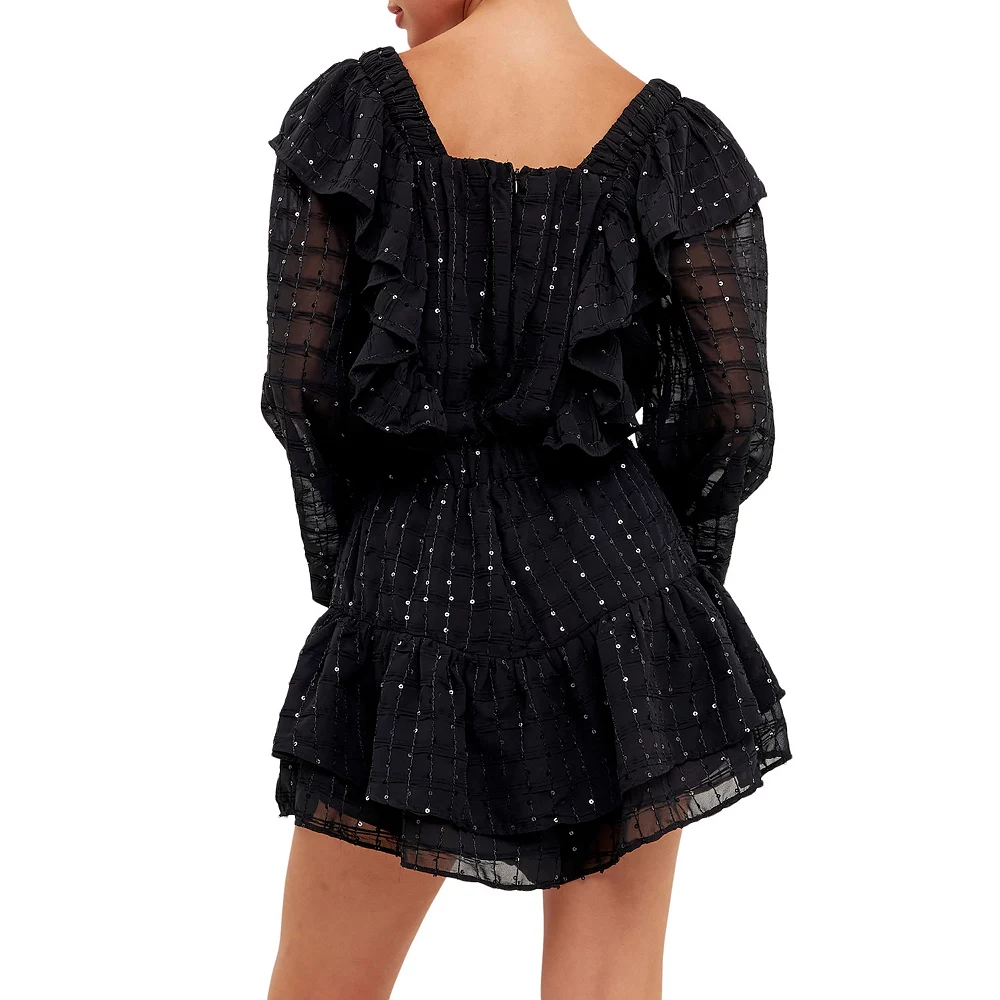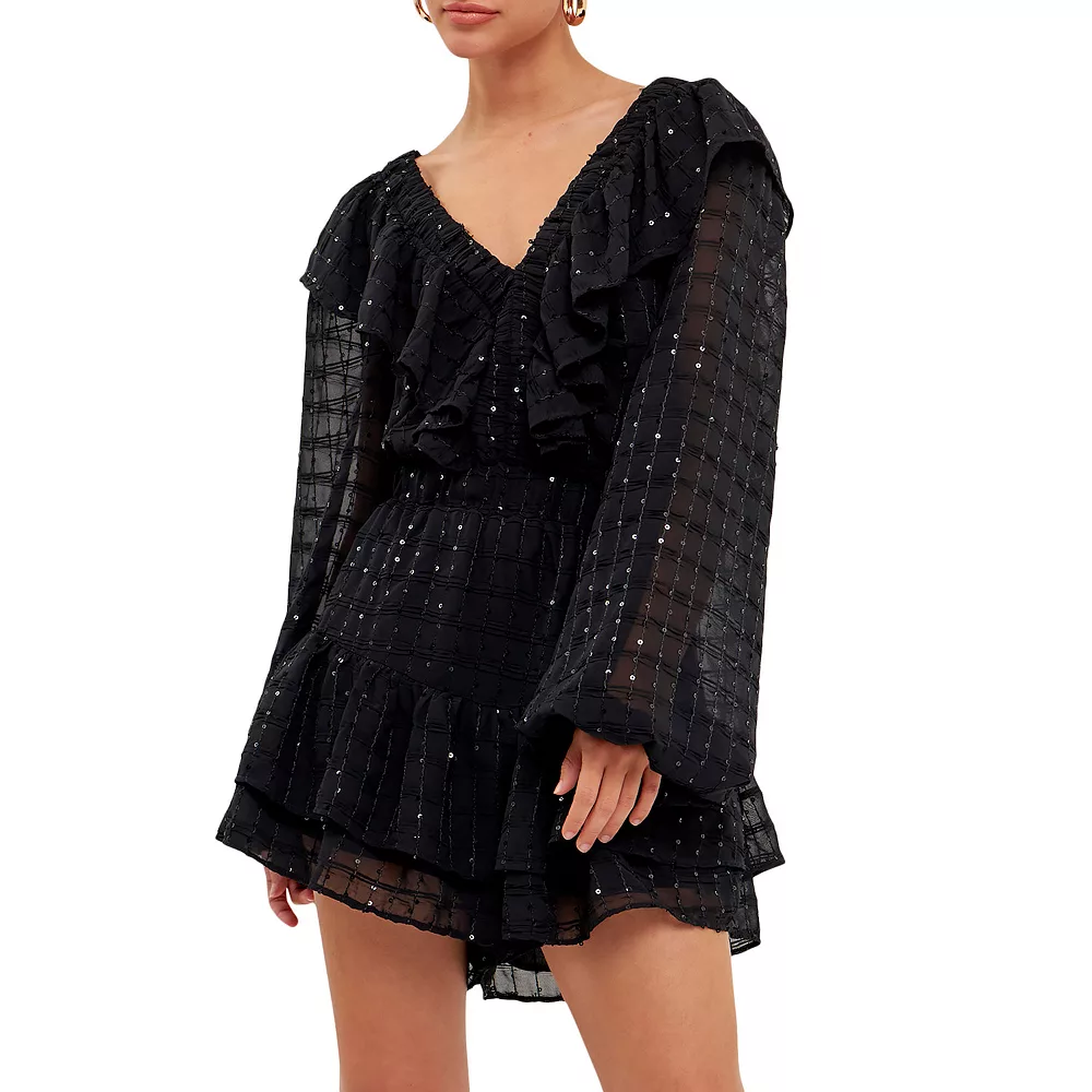 You will absolutely love this Endless Rose Sequins Ruffle Romper. It is the perfect combination of fun and flirty. The sequin embellishments add just the right amount of sparkle and the tiered ruffle shorts are sure to turn heads. It is also extremely comfortable with an elastic waistband and back zipper closure. You will want to wear this romper over and over again.