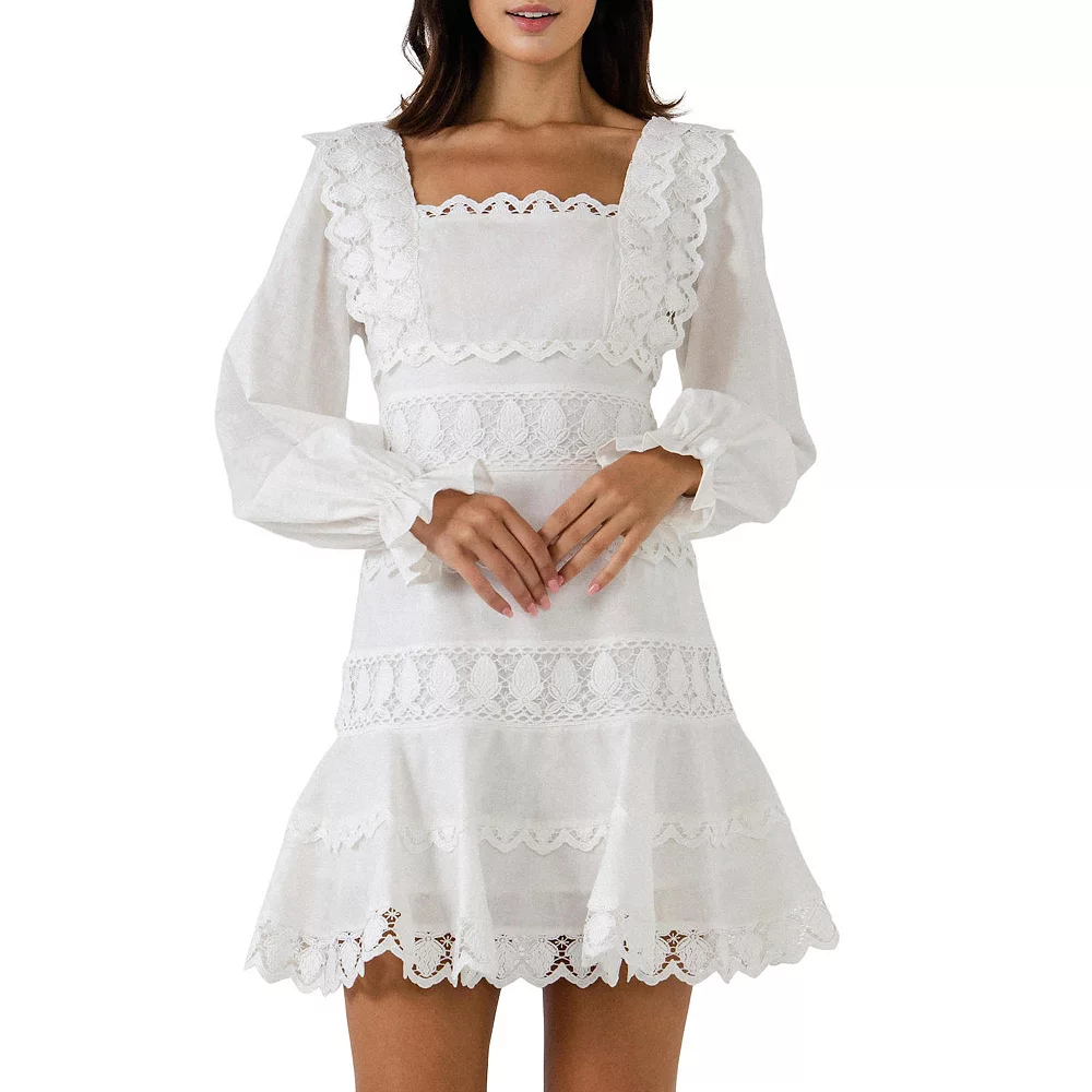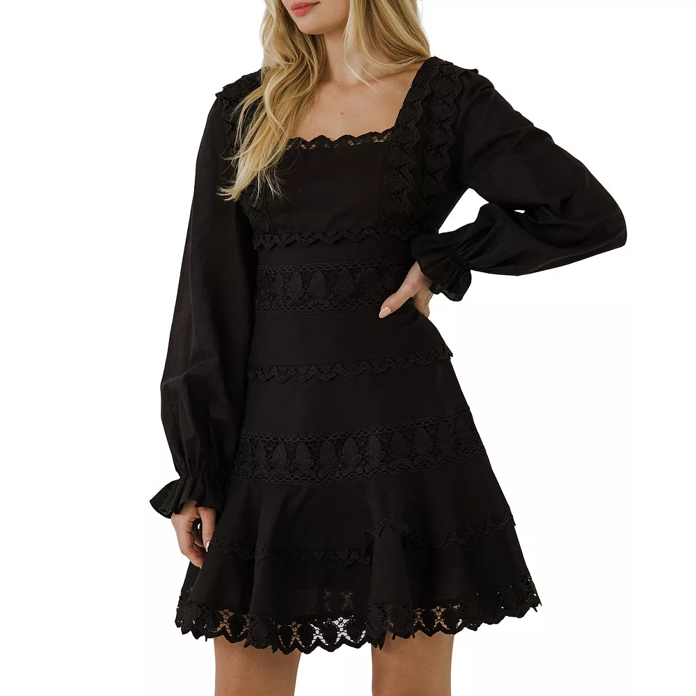 Elegant and timeless this divine piece features long sleeves a mini-length hem and an invisible back zipper. Lace trim inserts add a touch of luxury and femininity while the square neckline flatters your silhouette. Pair with chic heels and dainty accessories for a perfect special occasion look.