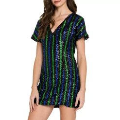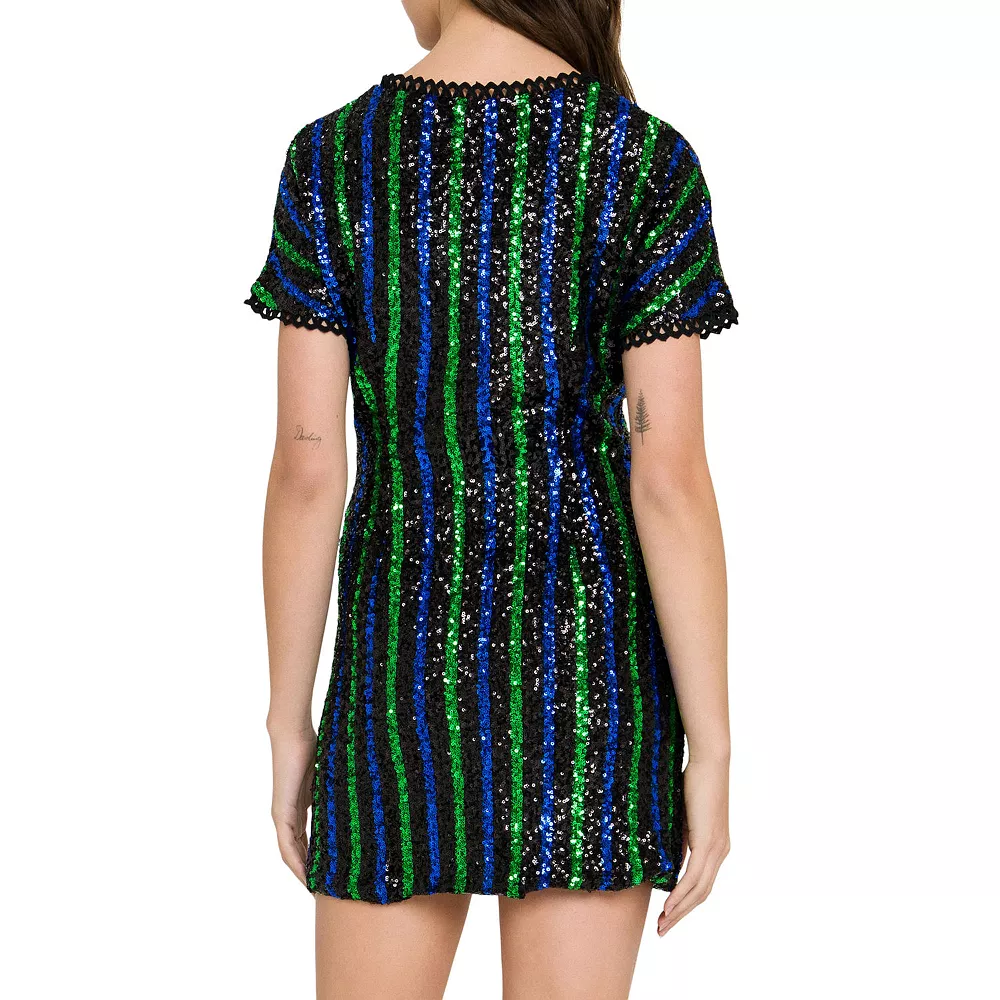 All eyes will be on you in this mini dress. With a multi-colored stripe sequin design, this dress is sure to turn heads. The lace trim along the neck and sleeves gives it a touch of elegance, while the v neckline ensures that you’ll feel confident and beautiful. Dress up or down with this versatile piece. Wear it to your next formal event or pair it with sandals for a more casual look. No matter what you choose, you’ll always look stunning.